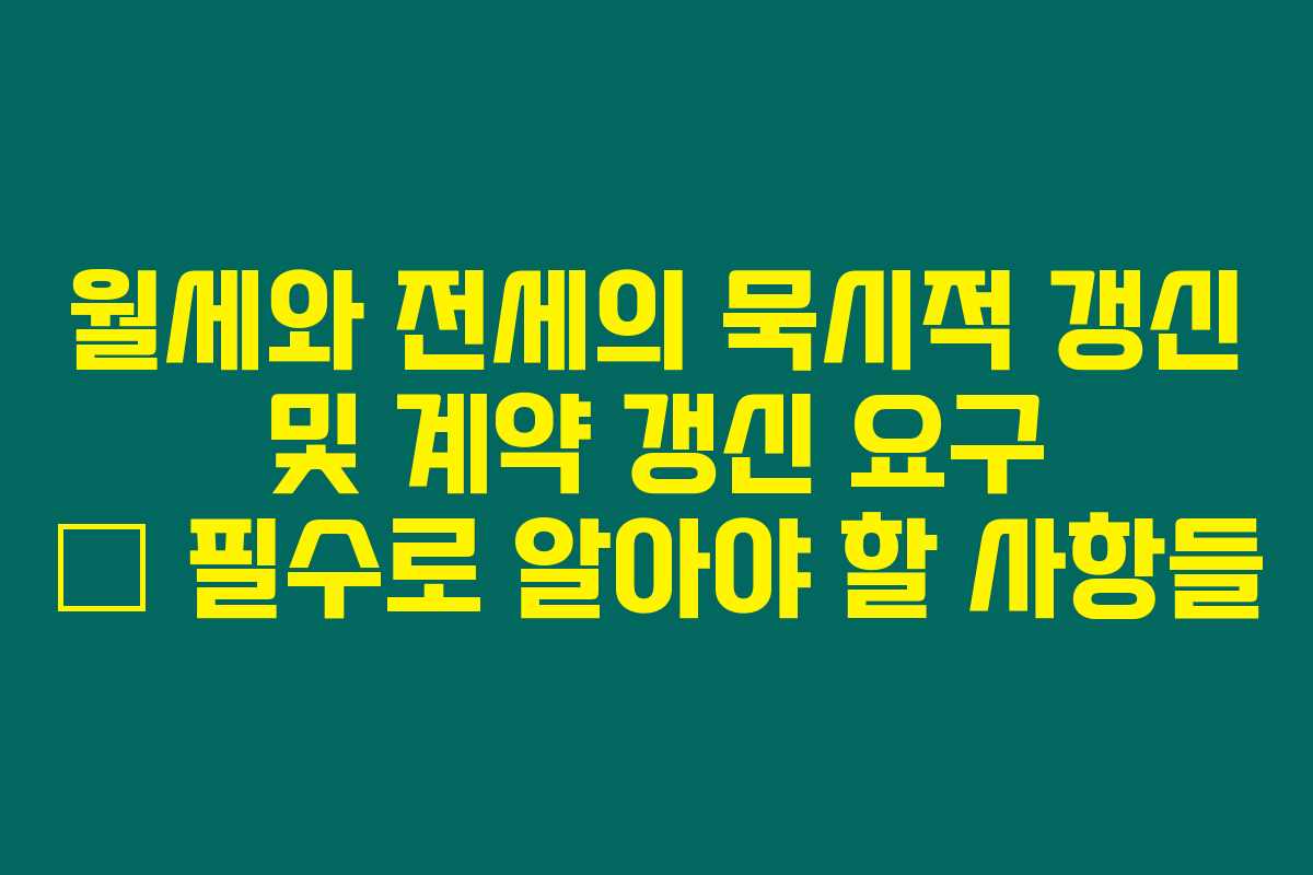 임대차 계약 만료가 다가오는데 집주인이 아무런 말을 안 하고 있다면, 그런 상황을 마주한 분들이 많을 거예요. 이럴 경우, 과연 어떻게 해야 할까요? 아래를 읽어보시면, 월세와 전세의 묵시적 갱신과 계약 갱신 요구에 대해 명확하게 이해할 수 있을 거예요.
