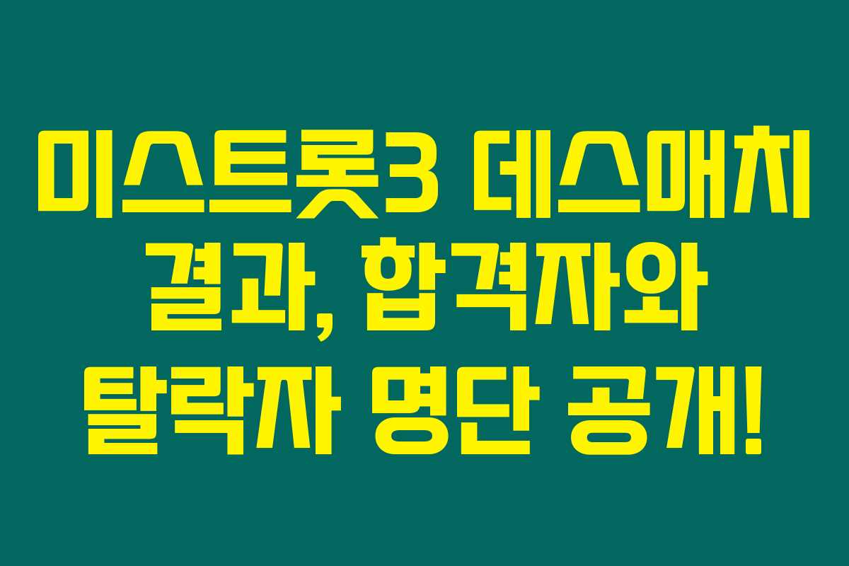 미스트롯3 팬이라면 꼭 알아야 할 최신 정보입니다. 요즘 모두가 기대하고 있는 데스매치 결과가 드디어 공개되었어요. 미스트롯3의 6회 방송에서는 어떤 가수들이 합격했는지 궁금한 분들은 주목해주세요! 아래를 읽어보시면 최신 데스매치에서 성공적으로 다음 라운드에 진출한 참가자와 아쉽게 탈락한 참가자들의 명단을 확인할 수 있습니다. 과연 여러분이 응원하는 가수는 어떤 결과를 맞았을까요?
