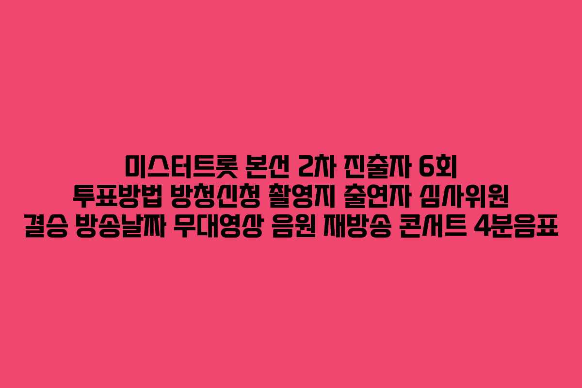아래를 읽어보시면 미스터트롯 본선 2차 진출자들의 투표방법 방청신청 절차 촬영지 출연자 심사위원 구성 결승 방송날짜 무대영상 음원 재방송 콘서트 일정까지 한 눈에 파악할 수 있습니다