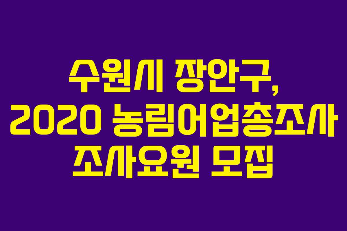 수원시 장안구에서는 오는 12월 시행 예정인 ‘2020 농림어업총조사’의 조사요원 23명을 모집합니다. 모집 마감일은 11월 9일까지이며, 이번 조사는 농림어업 관련 데이터를 수집하여 정책 수립의 기초자료로 활용됩니다.