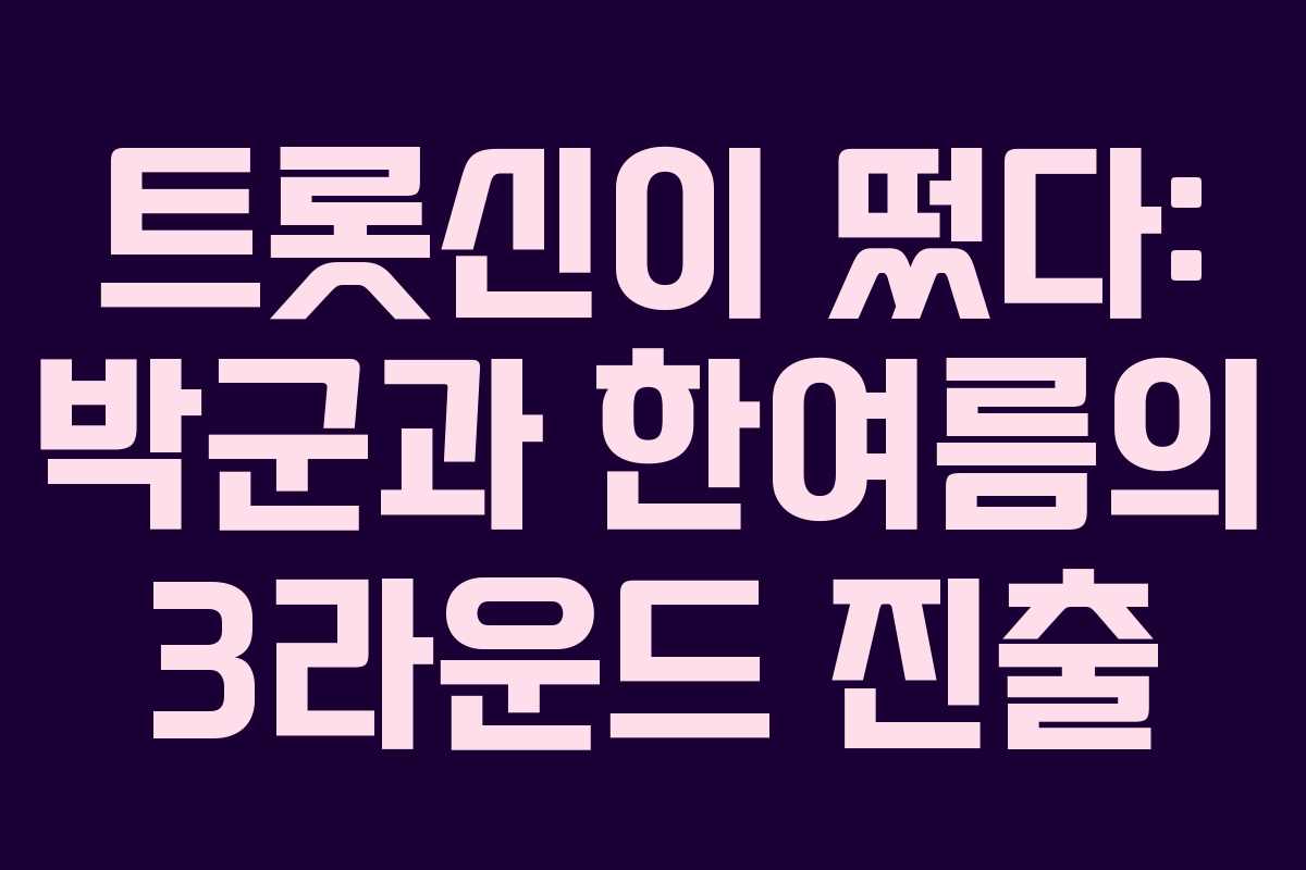 10월 7일 방송된 트롯신이 떴다에서 박군과 한여름이 뛰어난 무대로 극찬을 받으며 3라운드에 진출했습니다. 이번 방송에서는 남진, 장윤정, 진성, 설운도, 김연자 등 유명 팀이 참가하여 경쟁을 벌였습니다.