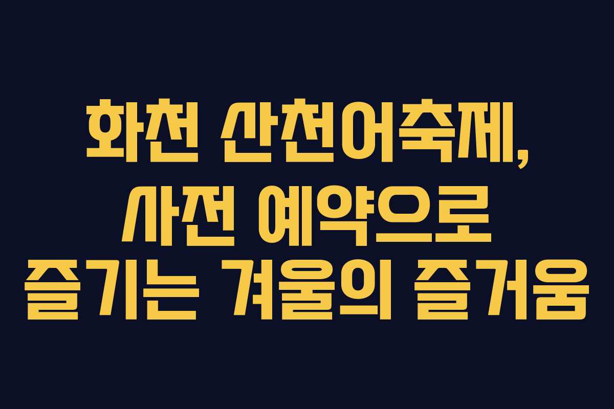 2026 화천 산천어축제는 겨울의 특별한 추억을 만들 수 있는 기회를 제공합니다. 사전 예약을 통해 대기 시간을 줄이고, 풍성한 겨울 축제를 즐기기 위한 준비를 하시기 바랍니다. 원하는 날짜에 맞춰 예약하여 즐거운 시간을 보내시기 바랍니다.