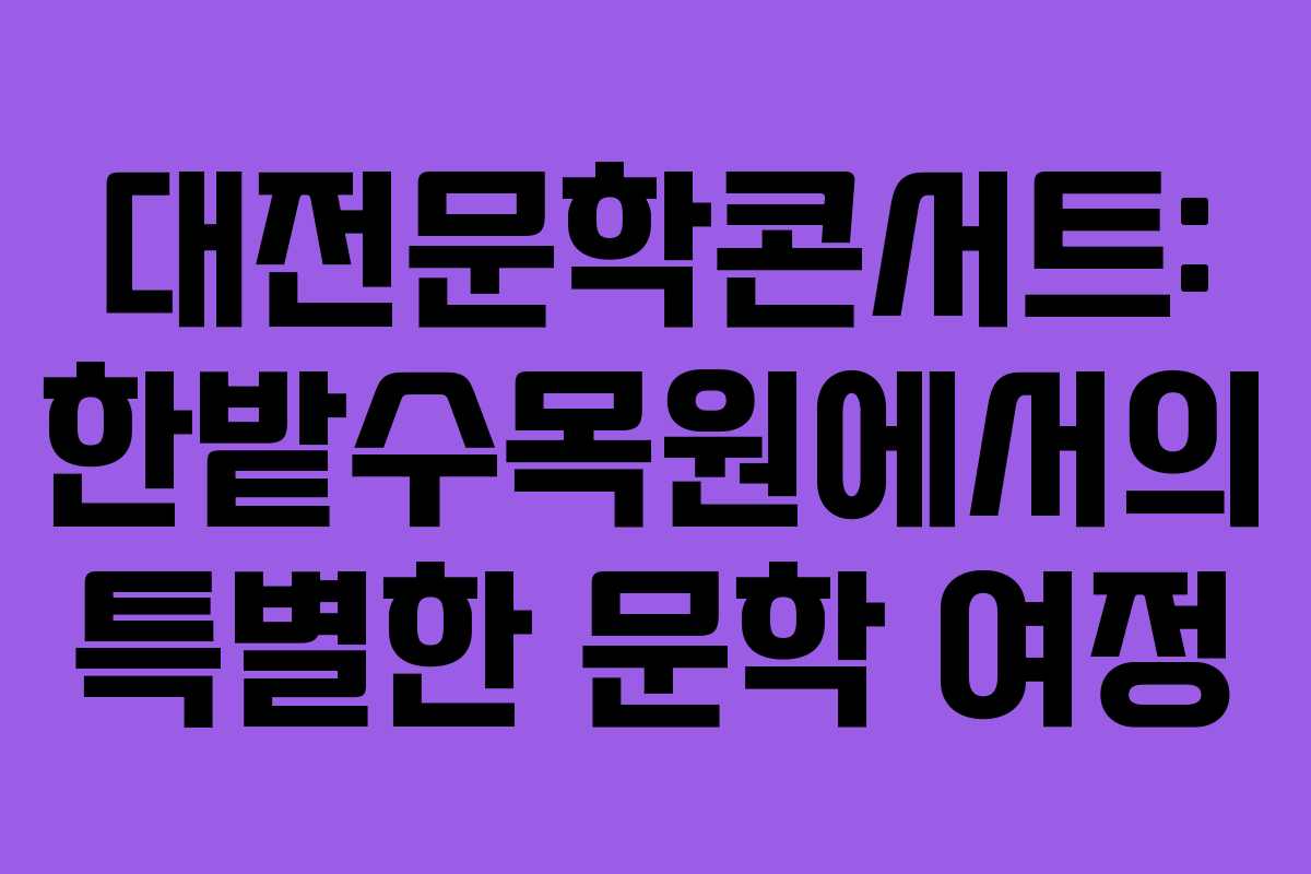 2026년 대전에서 펼쳐지는 문학의 향연, 대전문학콘서트가 한밭수목원 서원 야외광장에서 개최됩니다. 이 행사는 문학과 음악이 어우러지는 특별한 자리로, 다양한 프로그램이 준비되어 있어 많은 이들의 기대를 모으고 있습니다. 특히, 대전 지역의 문화적 자산을 한껏 느낄 수 있는 기회로, 문학 애호가들뿐만 아니라 가족 단위 방문객에게도 매력적인 장소입니다.